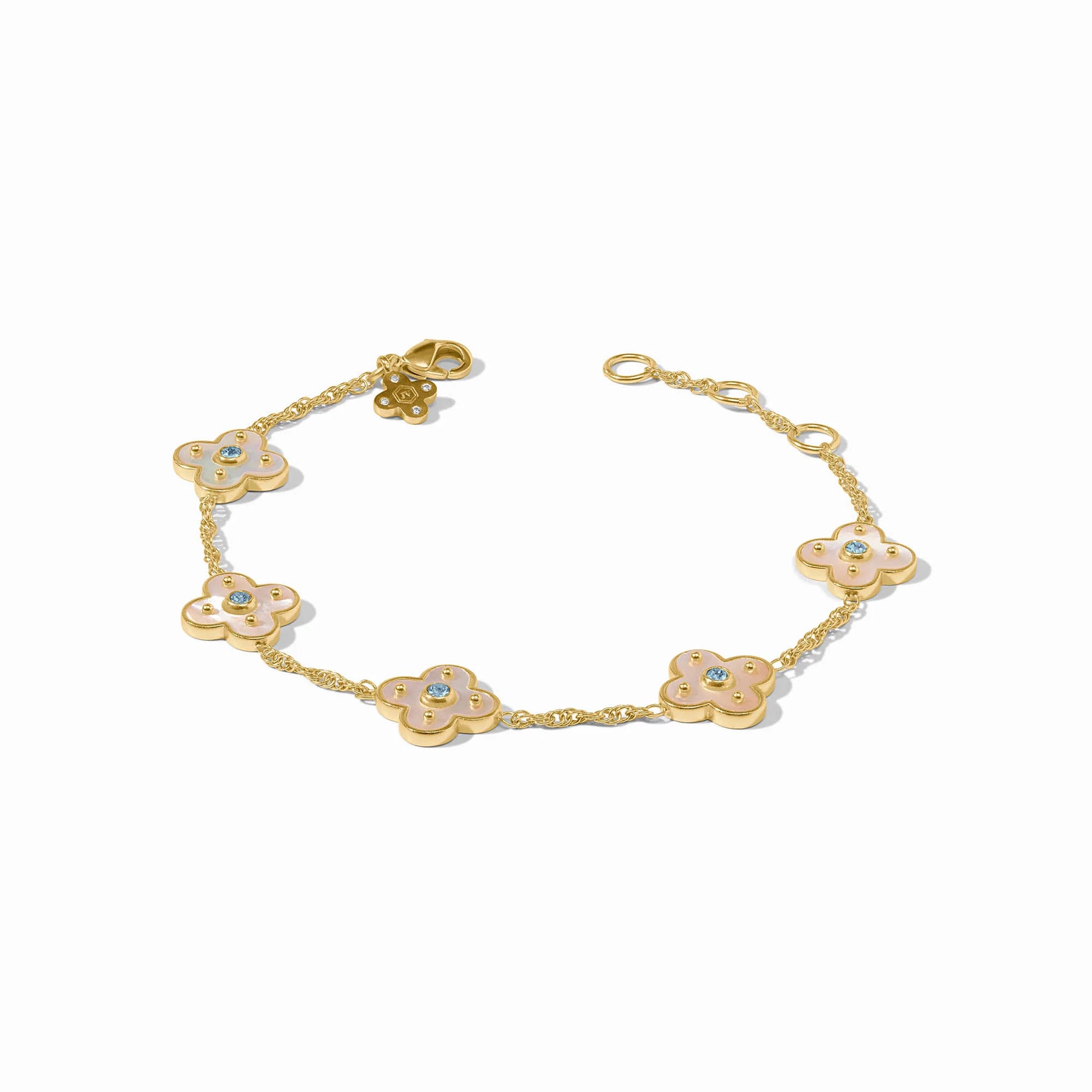 Elegant and effortlessly refined, the Colette Delicate Bracelet brings a soft shimmer to everyday styling. Five luminous quatrefoil stations—crafted in glowing mother of pearl and framed in rich 24K gold plate—are accented with a sparkling CZ center in your choice of soft Champagne or serene Chalcedony Blue.
