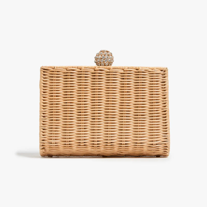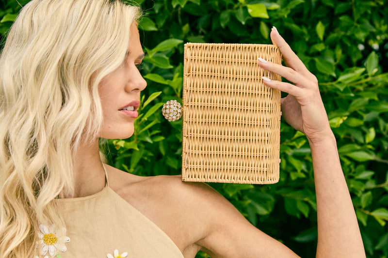 Spring 2025 takes us on an escape back in time. There is a vintage element and sense of nostalgia. Our signature rattan frame clutch has a new jeweled encrusted bauble that has a dreamy, 60s spirit.