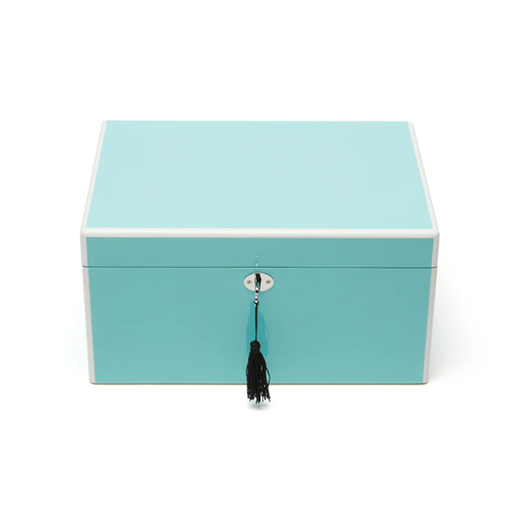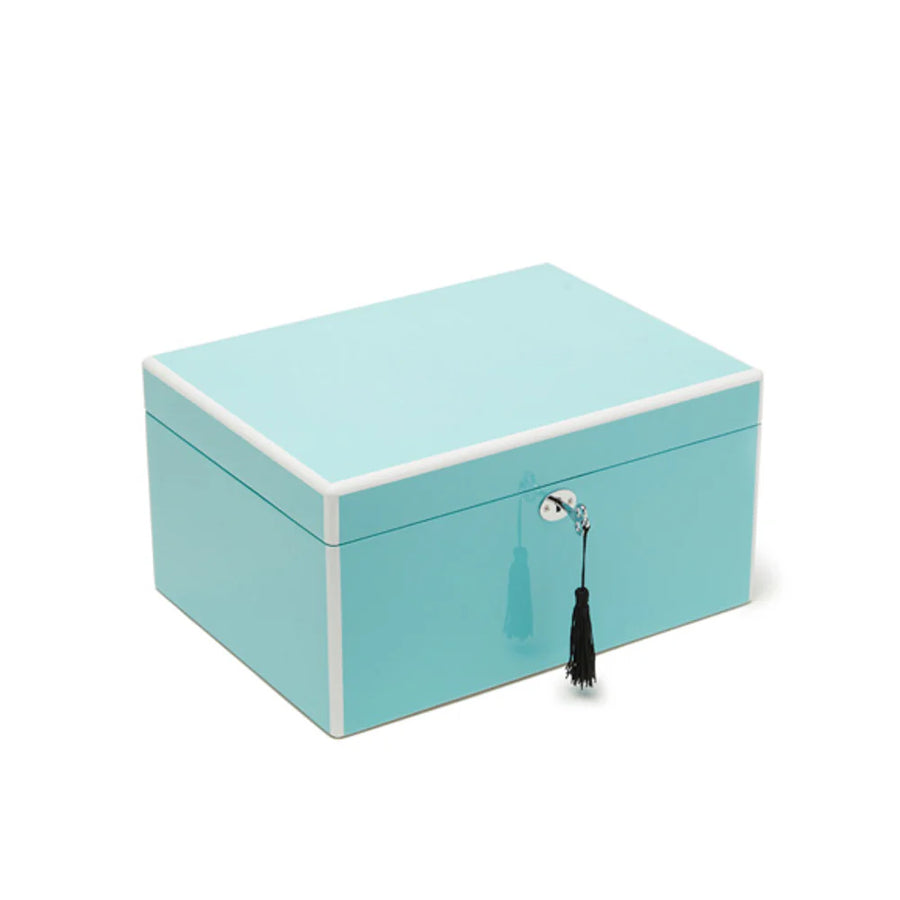 This sophisticated jewelry storage solution features a high-gloss lacquer finish in elegant Tiffany Blue. Crafted from quality wood with a protective interior lining, it includes two convenient pull-out organization trays for efficient storage of jewelry, keepsakes, and valuables. Dimensions: 12.25"L x 9.25"W x 8.5"H—perfectly proportioned for your dressing table or closet shelf.