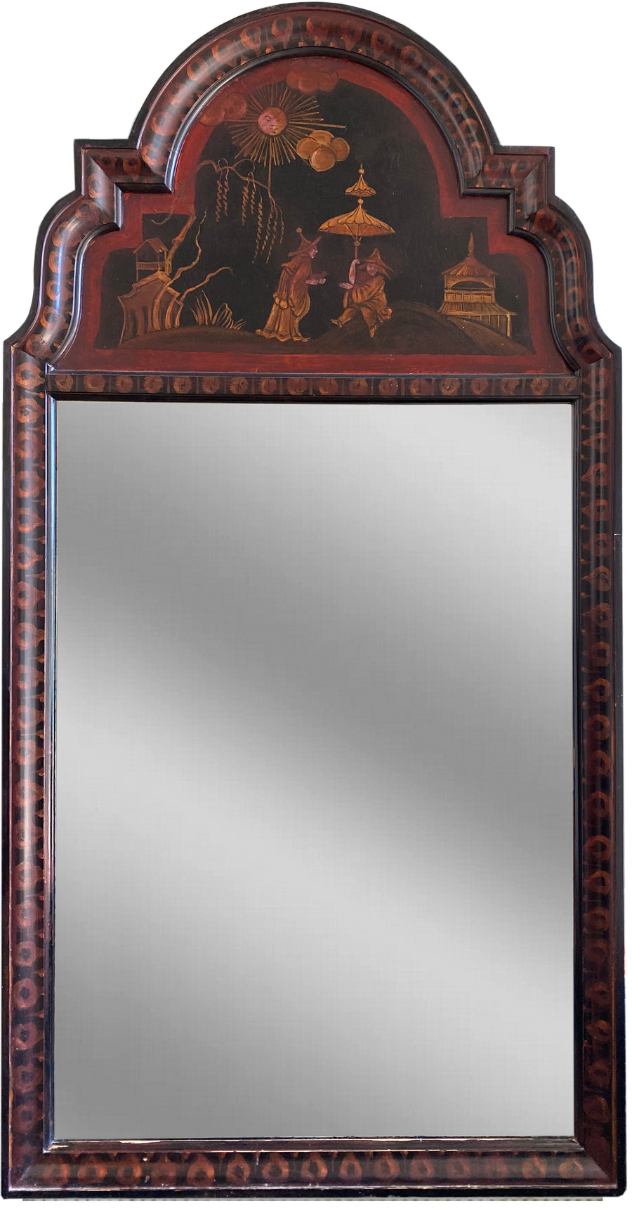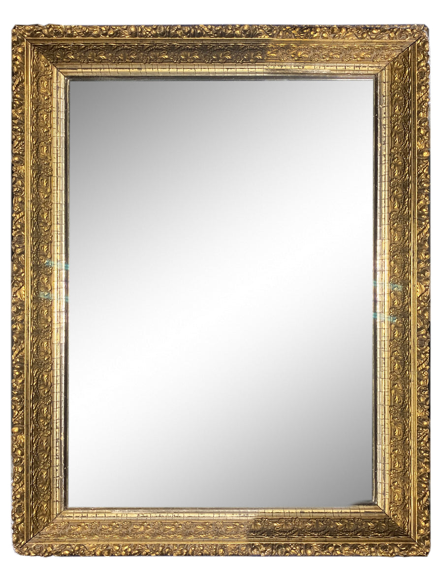 Fabulous 1970's giltwood cheval mirror. Sturdy and well crafted, the mirror sits on a graceful base with ball finials and feet. It features fine trim with decorative brass corner accents. A stately and elegant mirror with a lustrous gold patina.