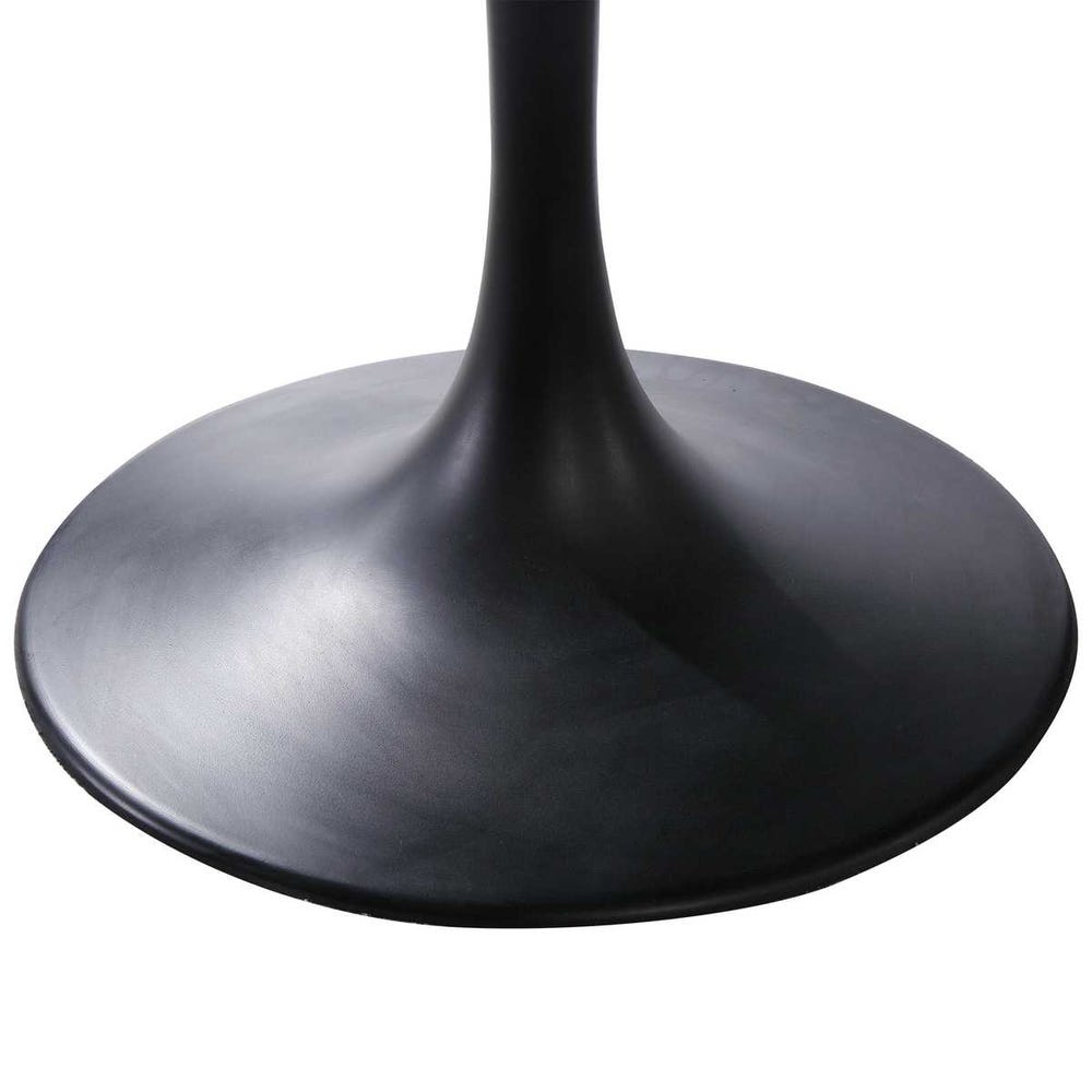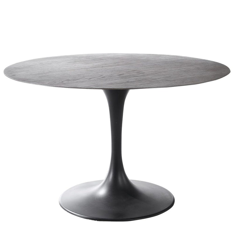 A mix of modern and industrial styling, featuring a 48 inch mushroom gray top in wire brushed oak veneer on a sturdy iron pedestal base in aged black.