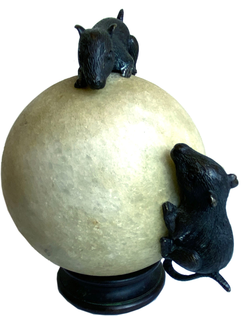 Charming bronze mice on a heavy stone sphere mounted on a base.