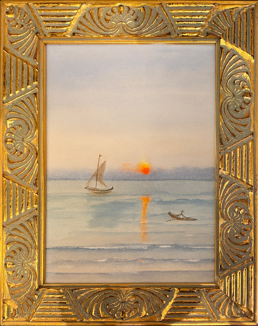 This charming watercolor painting captures the quiet beauty of the sea at sunset. Soft washes of blue and lavender set the scene as two small boats drift across gentle waves, while the warm glow of the setting sun reflects across the water. The piece is framed in an ornate gilded frame that enhances its timeless coastal charm. Measuring 9" high x 7" wide, this artwork is the perfect size to add a touch of serenity to a bookshelf, side table, or gallery wall. A lovely accent for collectors and ocean lovers alike.