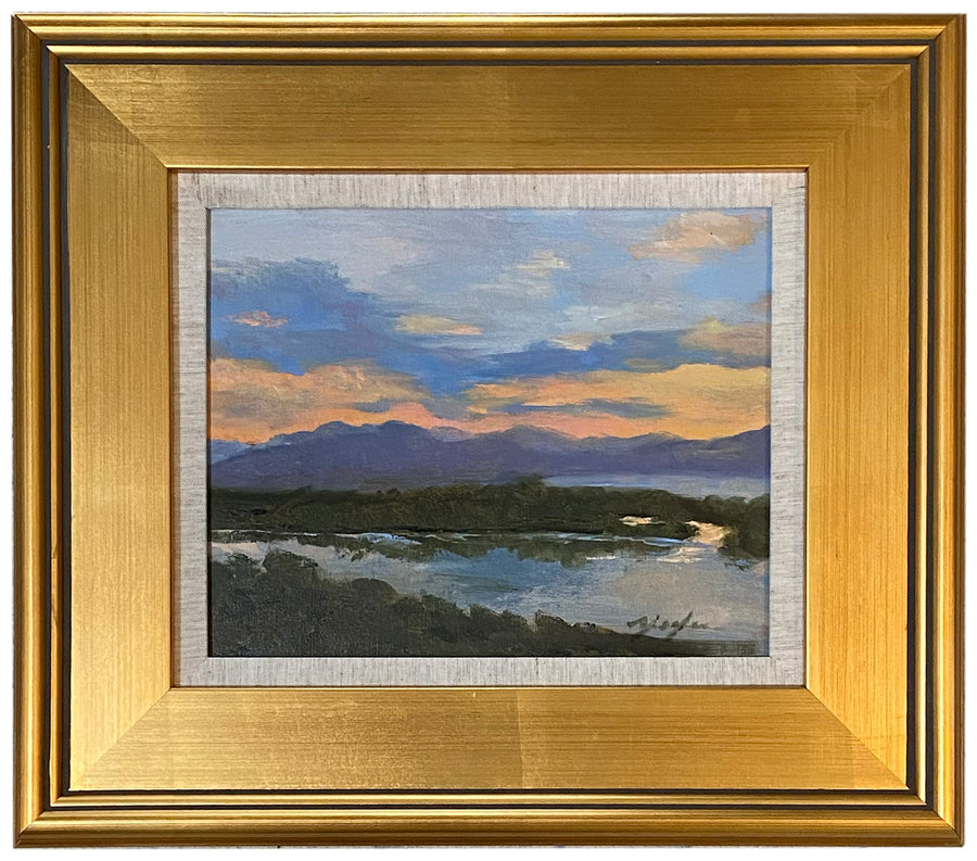 Local artist Nancy Zeigler’s Palm Springs View is a luminous original oil painting that captures the hushed elegance of day’s end. Painted in 2025, this work evokes the gentle quiet of dusk with its layered clouds, soft pastel hues, and the shadowed silhouette of distant mountains. The water below mirrors the sky’s fading light, drawing the viewer into a moment of calm and contemplation.