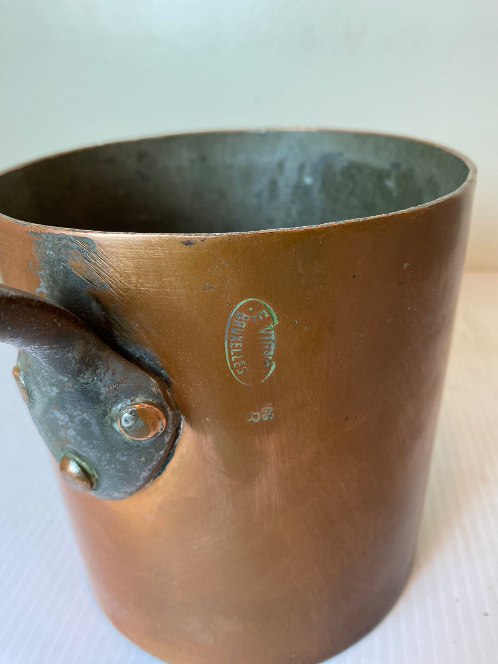 Vignol Bruxelles Antique saucepan, thick-walled, c. 19th century French copper chef’s pot with iron handle.