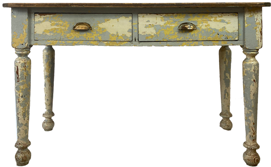 Small vintage folk art table. The table is painted pine with the original first layer of paint that has the authentic patina of time. The paint has also become distressed after years of use. The table also has two drawers in the center. The legs are a fun detail on this table. They are turned which creates the spheres and profiled edges and they also have the original blue paint which sets them apart from the rest of the table. The table is on the smaller side with a rustic patina and characterful appearance. The distressed two-toned paint and areas where the wood underneath shines trough marks the age and history of the piece.