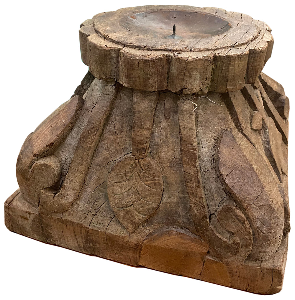 Antique Hand Carved Wooden Column Base. These stunning salvaged pieces were bases of carved pillars of old Indian colonial houses. Traces of old paint are still to be found, which just enhances the beautiful patina. Fantastic as a candle pillar holder, as it has a spike in place to hold.