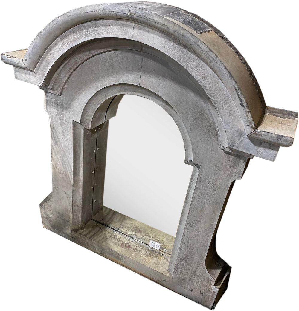 Sometimes referred to as a dormer, this zinc window frame is from France, circa 1880. First used during the 17th century, the dormers would typically be seen on upper levels of sloped roofs of French chateaux. The interior would contain a large glass pane, allowing light to penetrate dark rooms such as attics. The opening of this dormer has a recessed molding along the interior edge. This antique French zinc piece can still be used architecturally as a window surround, although a mirror has been installed in the interior opening, allowing the dormer to be used as a decorative mirror for a study, living room, bathroom or garden space.
