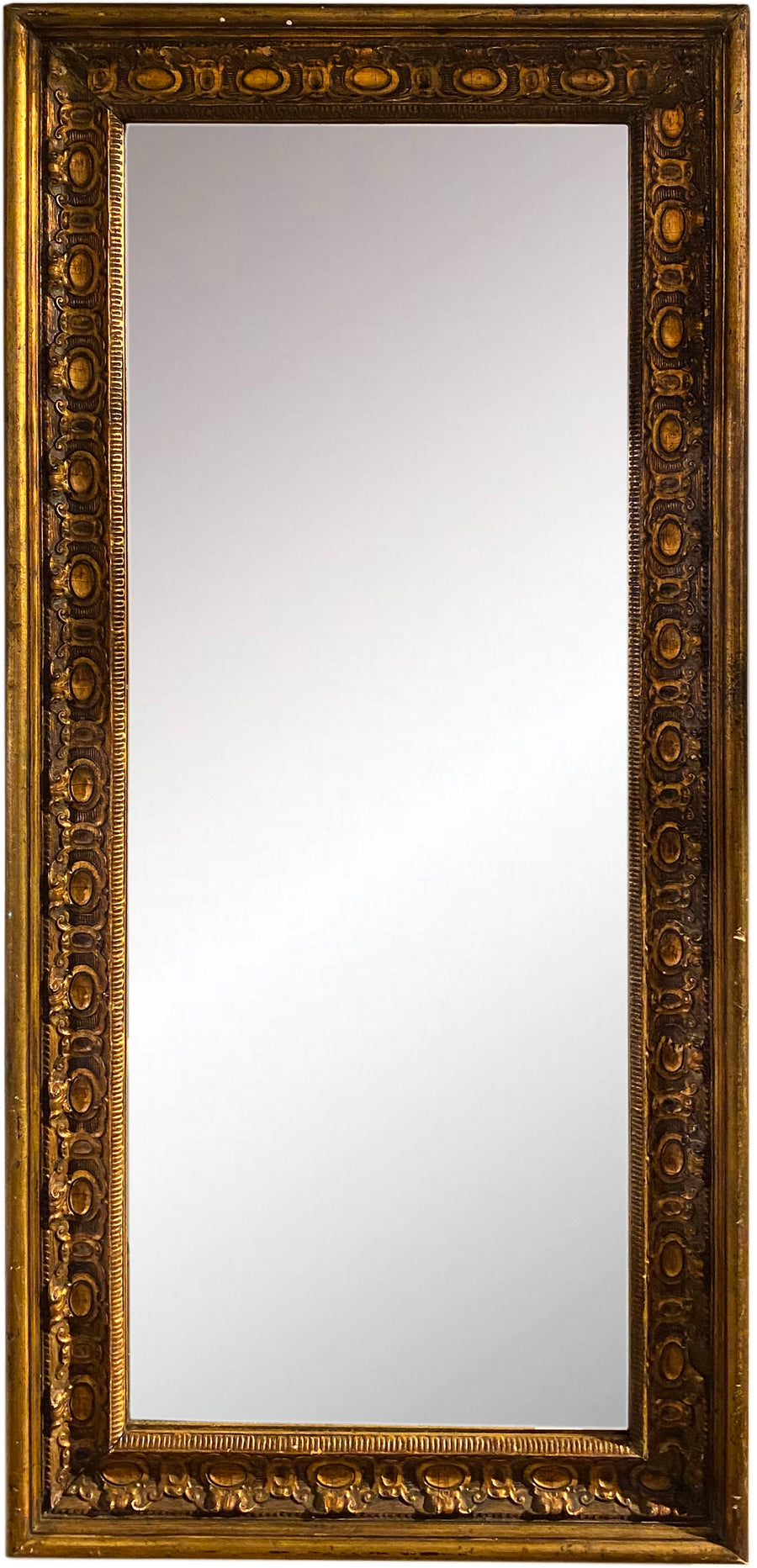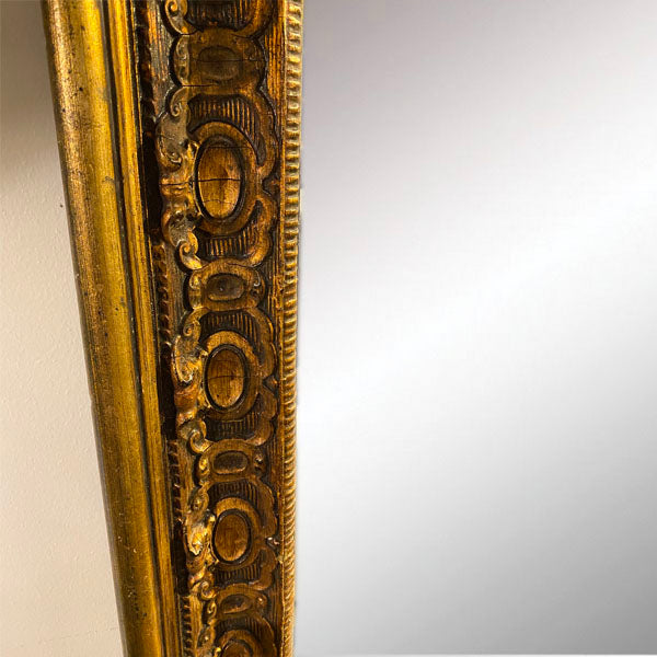 A handsome and large entry mirror in finely carved gilt wood with original mirror. France, early 20th century. Carved wood, covered with gesso and gold leaf finish.