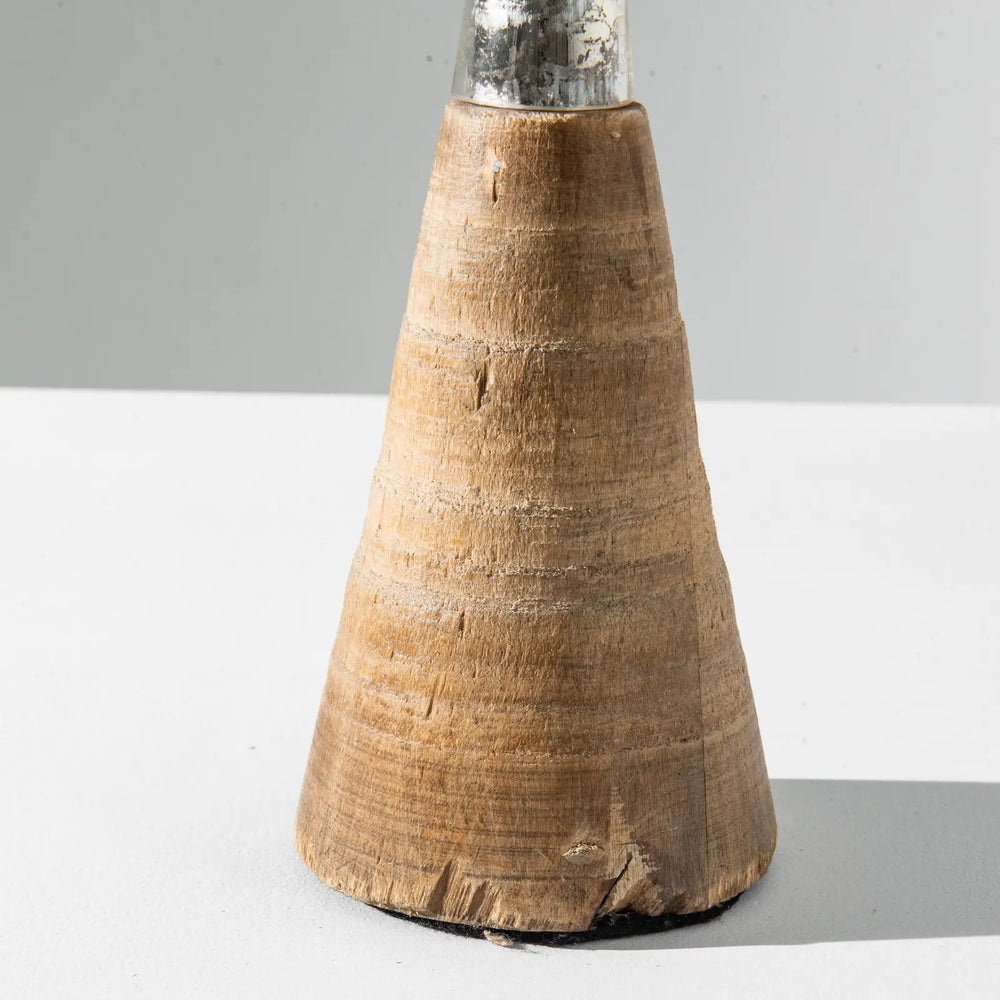Clear yet ethereal, this vintage wood and glass decoration makes an endlessly intriguing accent. Made in France in the 20th century, the composition has a graphic simplicity: a sphere of mercury glass sits atop a cone of natural wood. The silvered surface of the glass reflects the space that it is in, holding its surroundings captive within its bright orb. The chipped, rugged finish of the wood provides an earthy counterbalance to the mesmerizing globe, creating a piece which is fascinatingly sculptural.