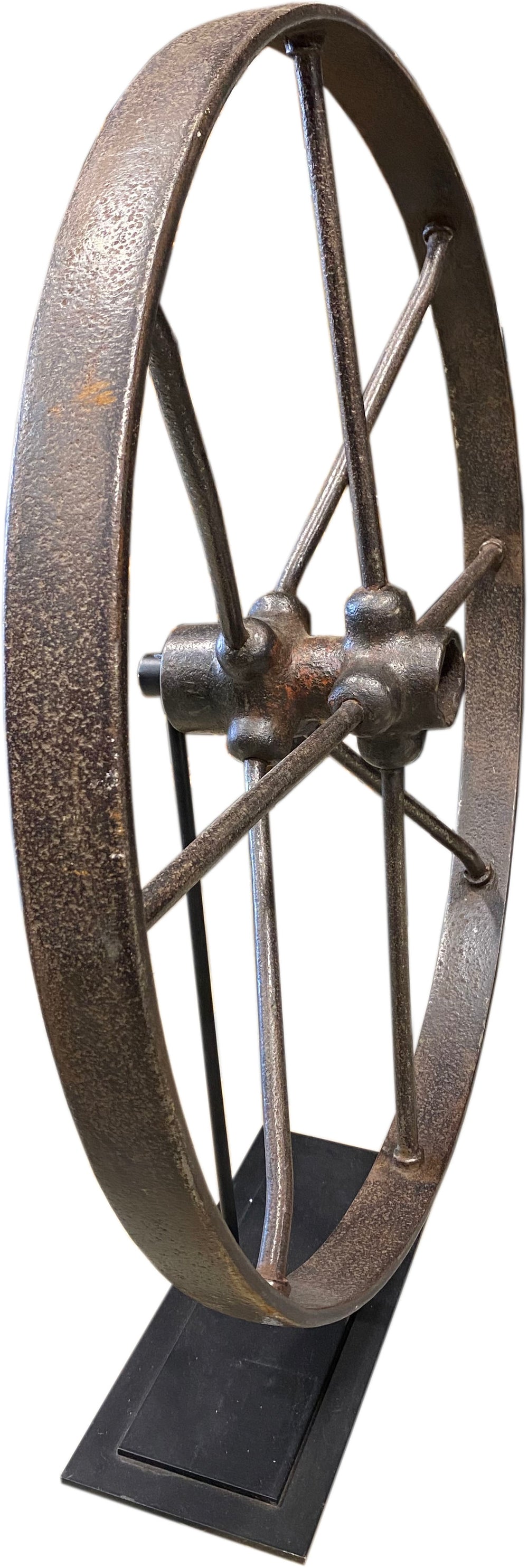 Bring some folk art into your home with this period iron wagon wheel. Impressive in size to make quite a statement. It has been expertly mounted a custom steel stand, allowing it to be placed on a fireplace, mantle or shelf.