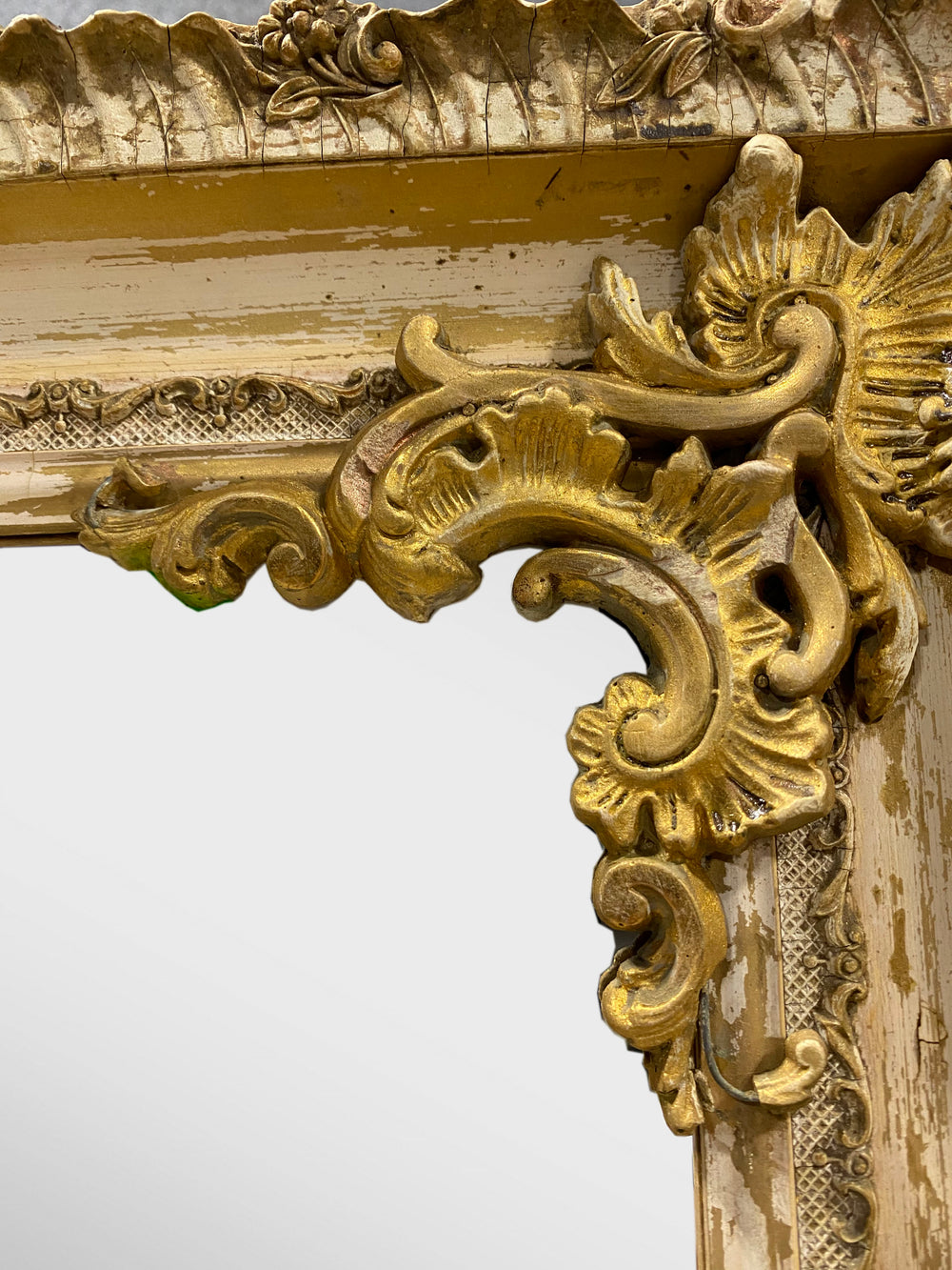A fine French 19th century mantel, hall, or floor mirror of exceptional quality and large proportions. The original mercury mirror glass plate of rectangular form is set within a fabulously hand-carved and molded painted frame. Traces of the original gold gilding can be seen on the beading as well as the outer edge of the frame. The original paint colors of cream make the overall look of this well patinated mirror truly gorgeous. The original glass shows traces of foxing and sparkling diamond dust at the bottom edge.