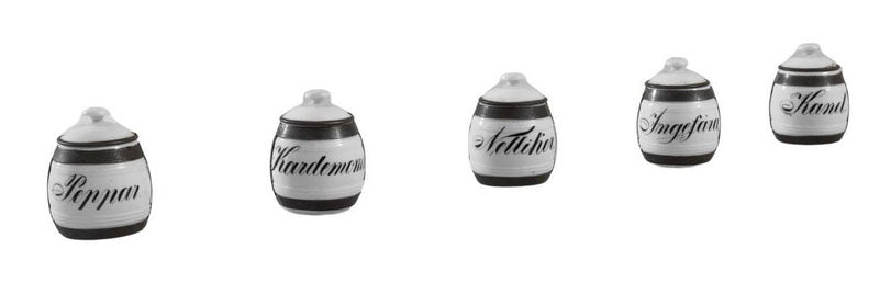 This delightful set of vintage ceramic spice jars evokes the homey simplicity of the Scandinavian country kitchen. Made at the turn of the century, the words on the sides of the jars — hand painted in beautiful cursive — indicate that this set was made in Sweden. The white china is accented with bands of dark iron, a curious detail which highlights both the pristine finish of the ceramic and the smokey patina of the metal. Each jar would have originally held one of the traditional spices used in Swedish baking: pepper, cardamon, ginger, cinnamon and cloves.