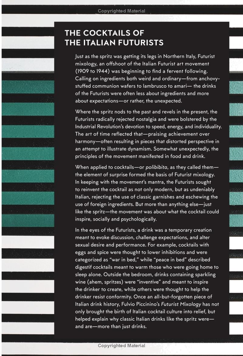 A narrative-driven book on the surprising history and current revival of spritz cocktails (a wine-based drink served as an aperitif), with 50 recipes, including both historical classics and modern updates.
