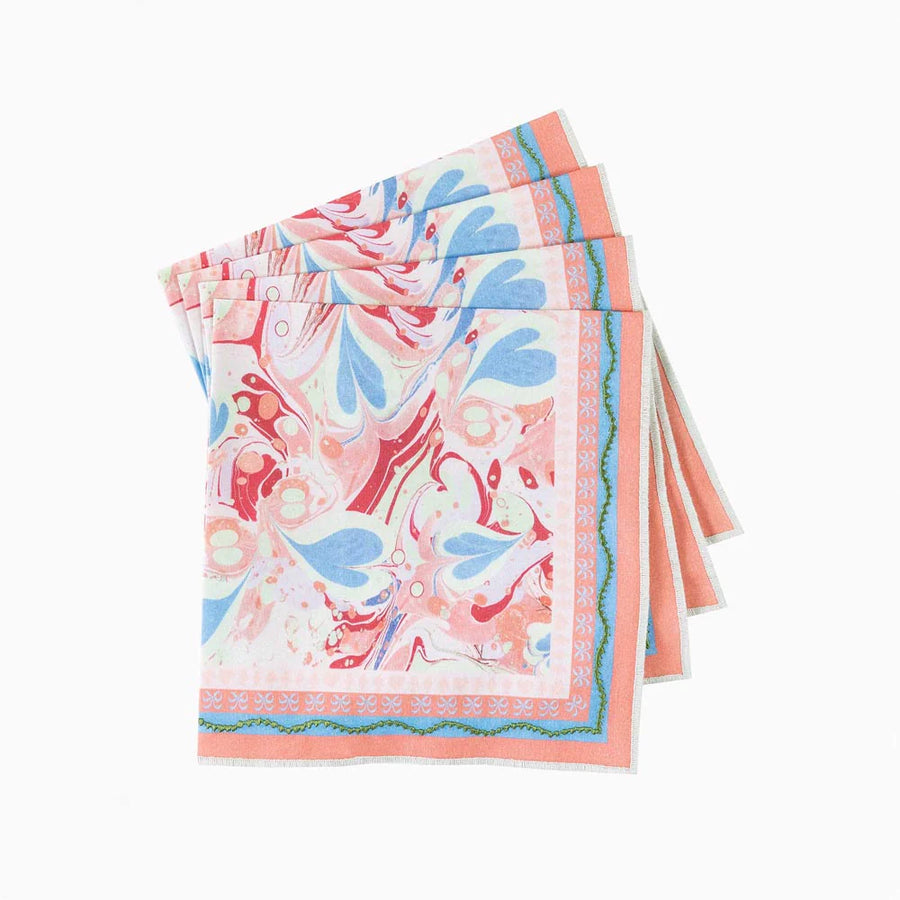 Whether hosting an elaborate meal or an intimate tea party, the Alice Marble Dinner Napkins perfectly meld adult sophistication with childhood whimsy. For the host who is unafraid to live vibrantly, we bring you this exquisite statement piece inspired by an iconic children’s classic. Designed by marble artisan, Tara Roma Gill, these gorgeous table linens bring the slow and precise art of paper marbling to life.