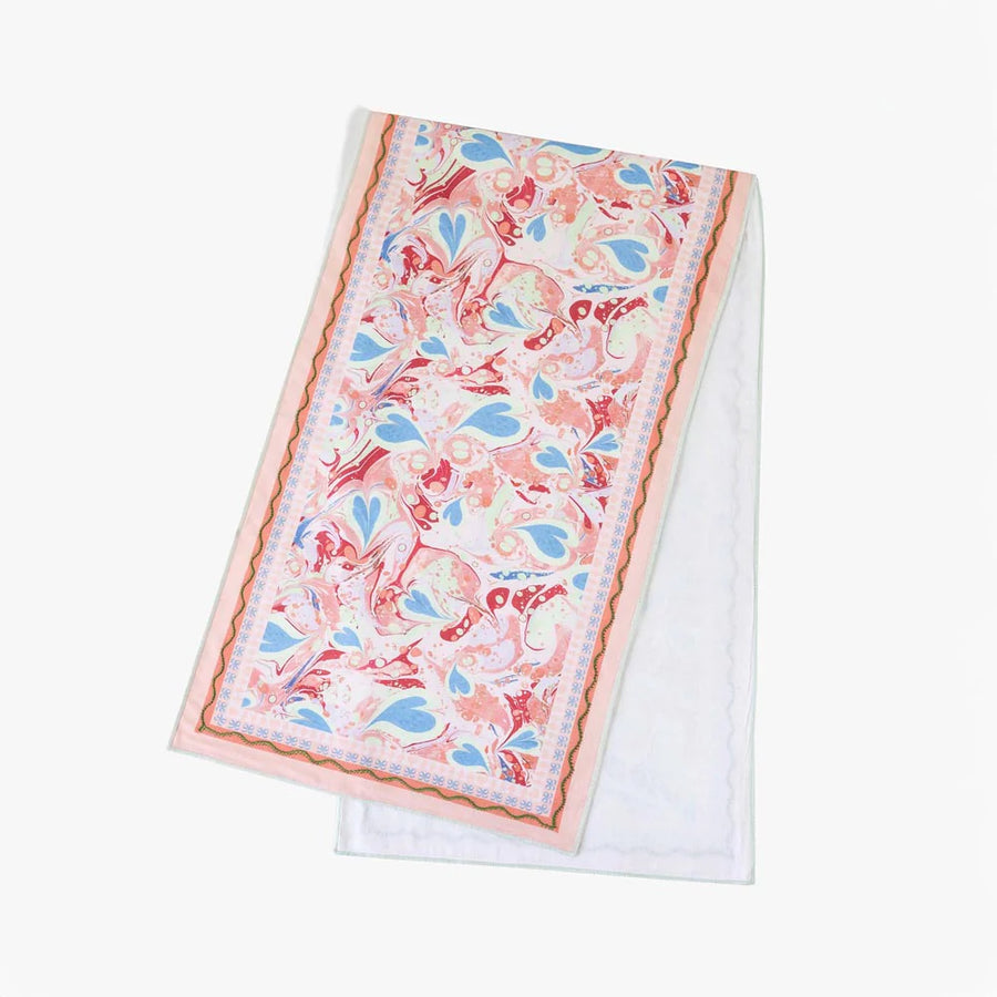 The Table Runner features the original marbled paper pattern created by Tara Roma Gill for the Alice in Wonderland Art Novel. Resplendent in blush pinks, corals, and striking crimson, with delicate accents of sky blue and mint green hearts, her playful yet elegant use of color channels the curious spirit of the character we all know and adore.