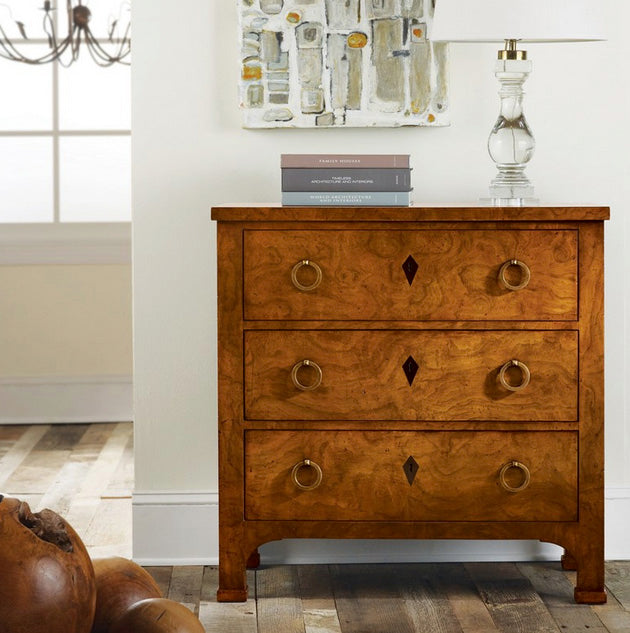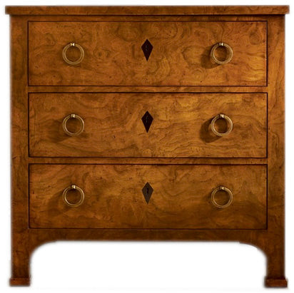 The 19th-century European design was updated with a transitional flair. Hand-cut walnut veneer and inlays. Cast brass-trimmed hardware and details. Oak-lined drawers with art soft-close mechanism. Beautiful hand-rubbed finish.
