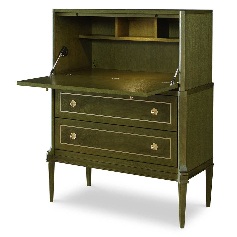 A modern design inspired by elegant Regency style, this oak cabinet features two generously sized storage drawers on bottom and one cleverly-concealed pull-down door on top, that when open, converts into a functioning desktop and reveals additional storage space, three cubbies, and an LED touch-button dimmer switch with adjustable lighting. Additional details include custom solid brass pulls, center panels of olive ash burl set within brass-finished metal frames, and tapered legs. A deep rich olive green finish with matte gold glaze highlights the wood's natural grain.