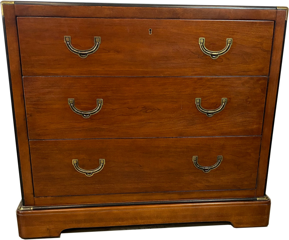 Crafted by National Mt. Airy, this sophisticated pair of vintage campaign-style chests showcases the brand’s signature quality and timeless design. Each chest features three roomy drawers with classic brass campaign pulls and clean-lined corner details, all set in a warm, medium-toned wood finish. The subtle recessed plinth bases and bracket cutouts provide elegant grounding, while the chests' symmetrical design makes them ideal for use as nightstands, bedside tables or accent pieces in any refined interior.