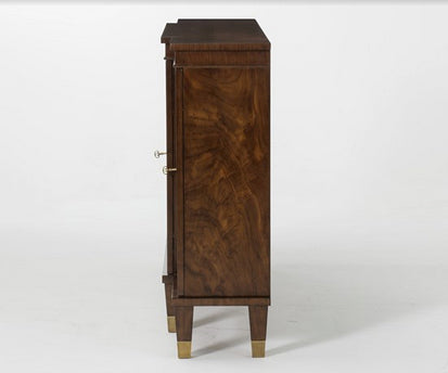 Hand rubbed finish, working brass locks, feathered walnut veneer