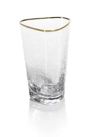Part of the Aperitivo collection, this highball glass has a unique triangular shape with textured glass and a gold rim. Mouth-blown glass with hammered texture and hand painted 24K gold rim.