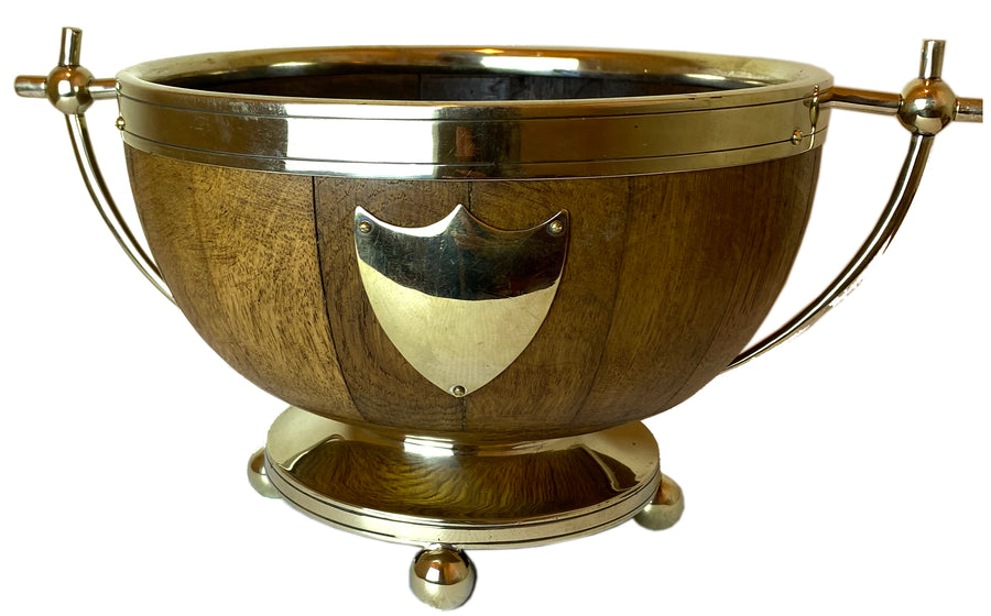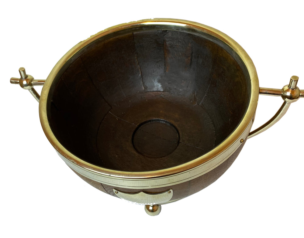 This is an antique fruit bowl. An English, oak and silver plate country house serving dish, dating to the Victorian period, circa 1870.
