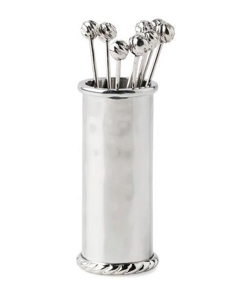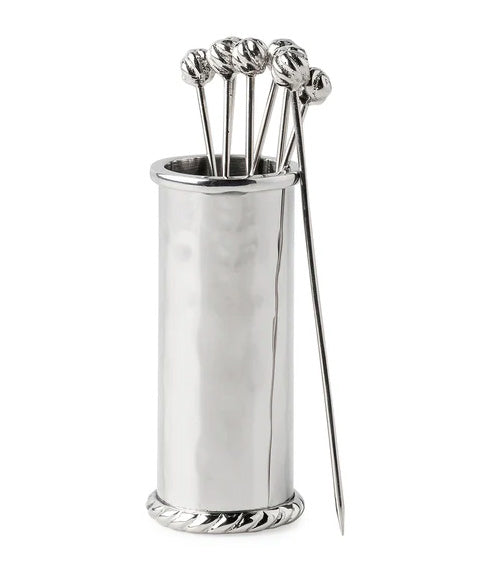 Decorated with a tidy trimming of simple thread, each piece in our Graham barware collection is handmade in hammered stainless steel and polished to brilliance. This set of eight cocktail picks with accompanying holder works wonderfully for skewering a maraschino cherry or olive for your favorite craft cocktail. Each pick is adorned with a decorative finial.