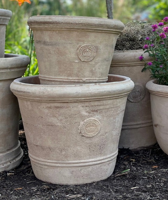 Authentic English inspired Kew Palmhouse Pots with the official seal of the Royal Botanical Gardens, Kew. These pots come in 3 large sizes and are entirely handcrafted by Artisans, they are suitable for outdoor use as they and are frost proof! With each purchase of these beautiful pieces, funds are contributed to the gardens and its important, on-going work. Each item is individually crafted and therefore no two items are identical and minor imperfections are inherent and add to the beauty of these products.