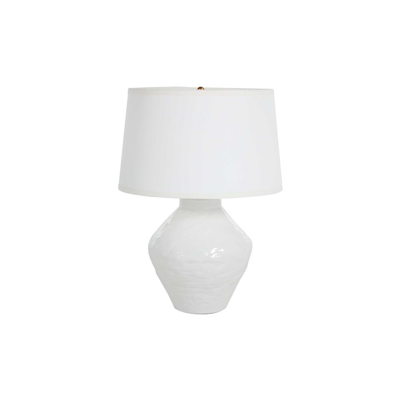 The classic all white ceramic base of the Laguna Lamp is paired with a white linen shade for a monochromatic accent lamp. Slight differences in height should be expected for this handmade lamp.