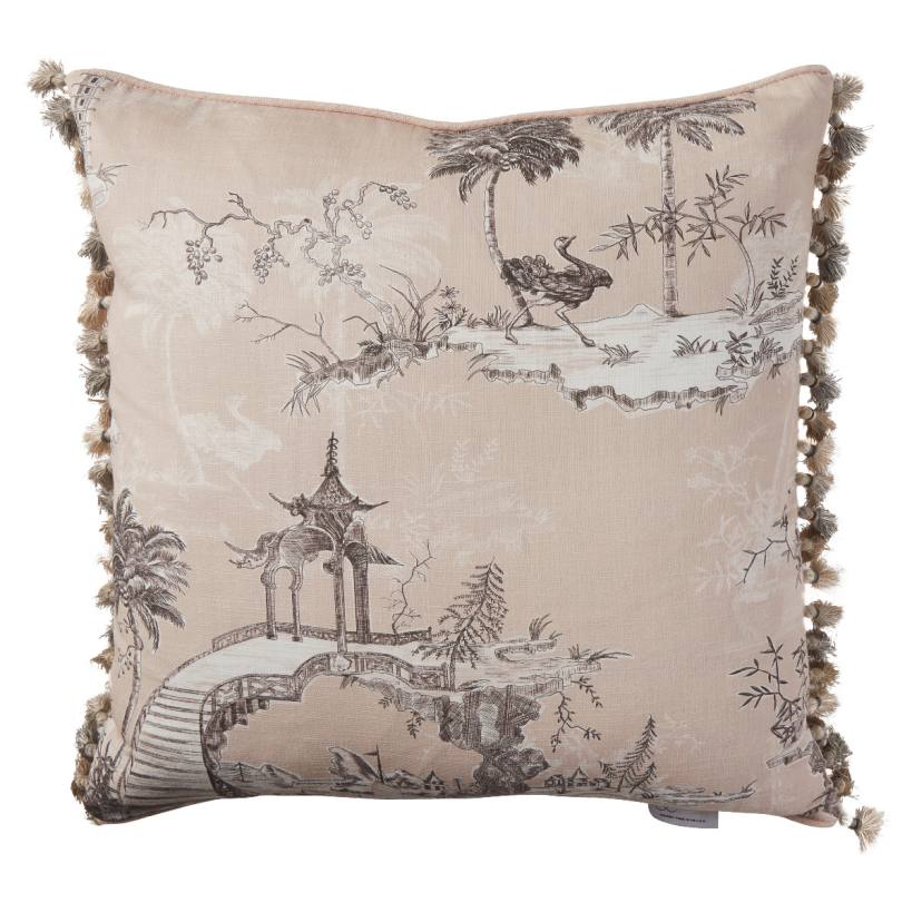 Chinoiserie fabric in beautiful blush tones with tassel trim detail on left and right edge of pillow. Measures 20 inch square