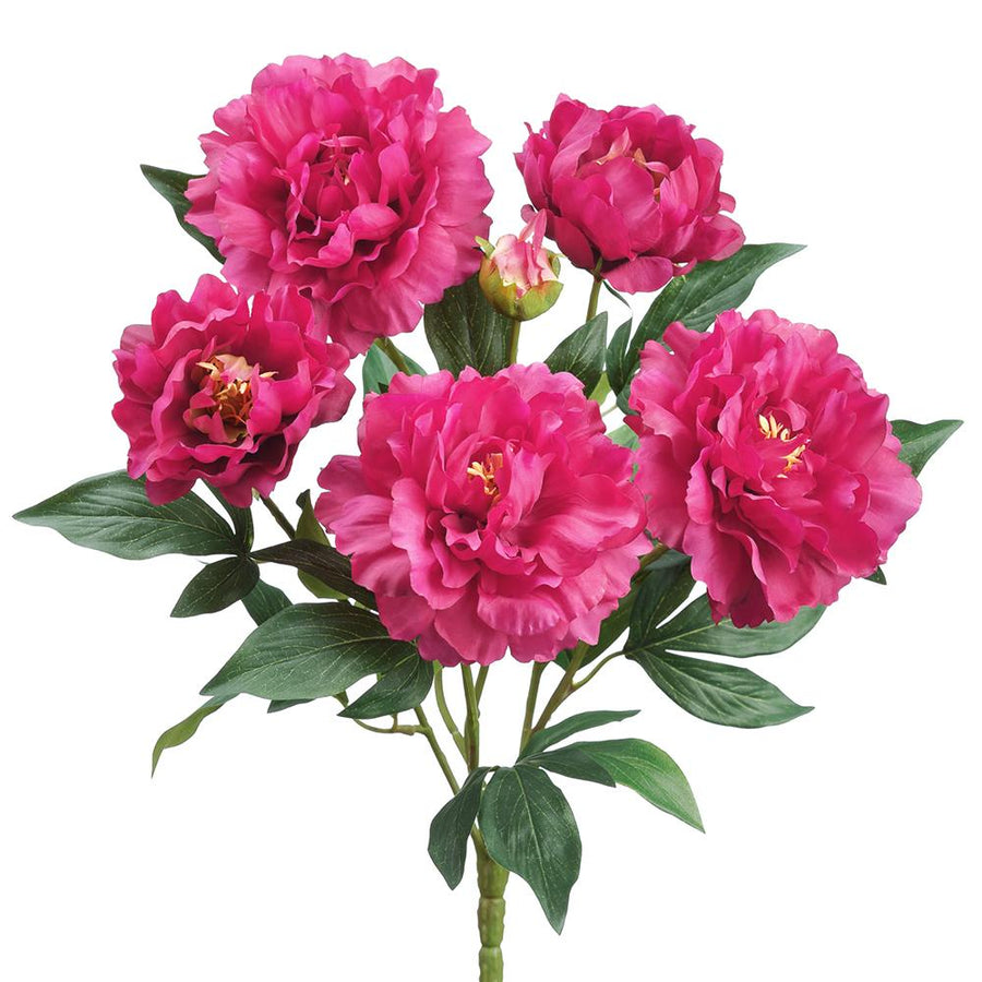 Bring vibrant color and lush texture to your arrangements with this 18" Peony Bundle in bold fuchsia. Featuring five full, ruffled blooms and realistic green foliage, this bundle adds a cheerful, garden-fresh look to any space. Perfect for filling vases, enhancing centerpieces, or brightening a spring mantel, these lifelike silk peonies offer all the beauty of fresh flowers with none of the maintenance.