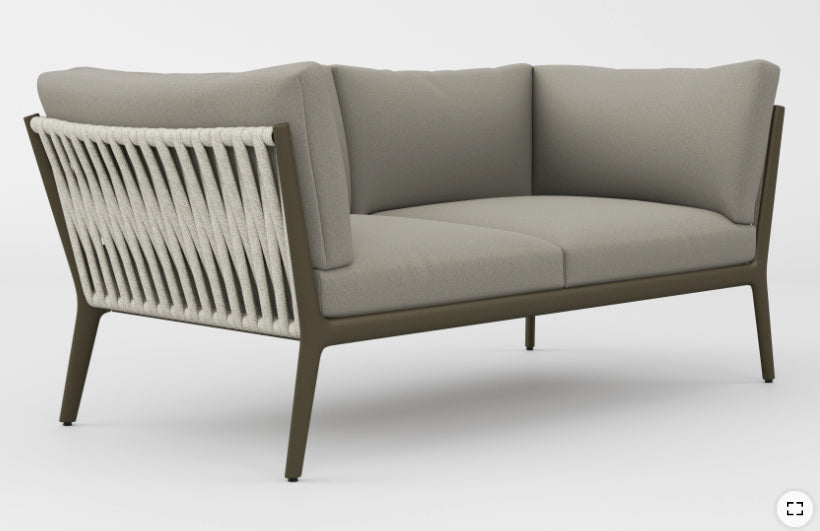 The H Loveseat takes a classic mix of materials for a new spin by adding enticing curves and finishes, for a completely fresh look. Named for the first letter of the word “hoy”—“today,” in Spanish—the H Loveseat by Toan Nguyen utilizes 3-inch diameter rope create a dramatic, sculptural effect against its streamlined aluminum frames. It features a plush seating cushion and a transitional design.