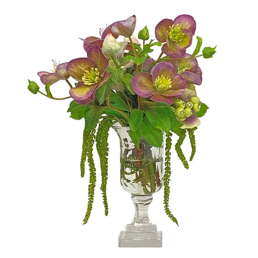 Enhance any room with the stunning display of realistic hellebores, also known as Lenten roses, in a beautiful cut vase. This exquisite arrangement will add a touch of elegance and liveliness to your space.