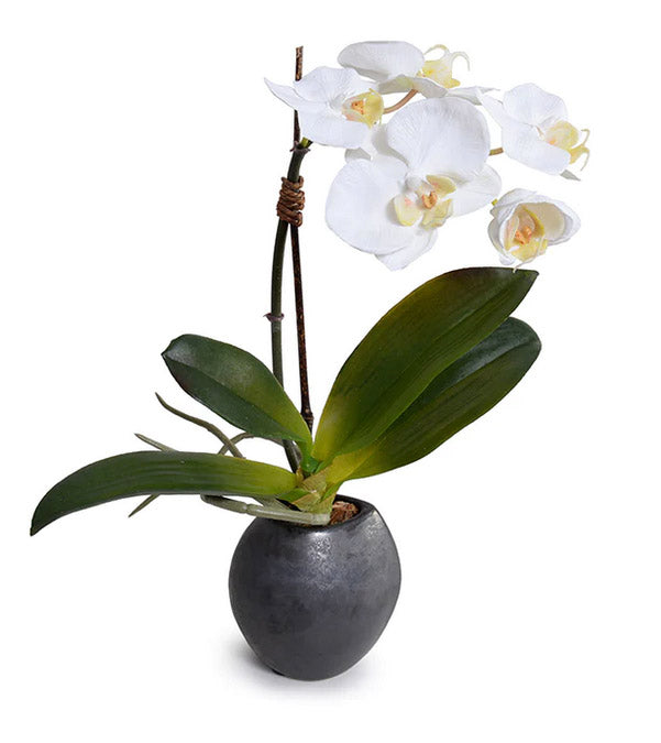 This premium blooming flower stem of the classic Phalaenopsis plant is planted into a contemporary matte black egg shaped vase. The single white faux stem is attached to natural black bamboo, with artificial pre-shaped leaves at the base of each stem. this 13" small orchid is delicately arranged by hand in our North Carolina workshop.