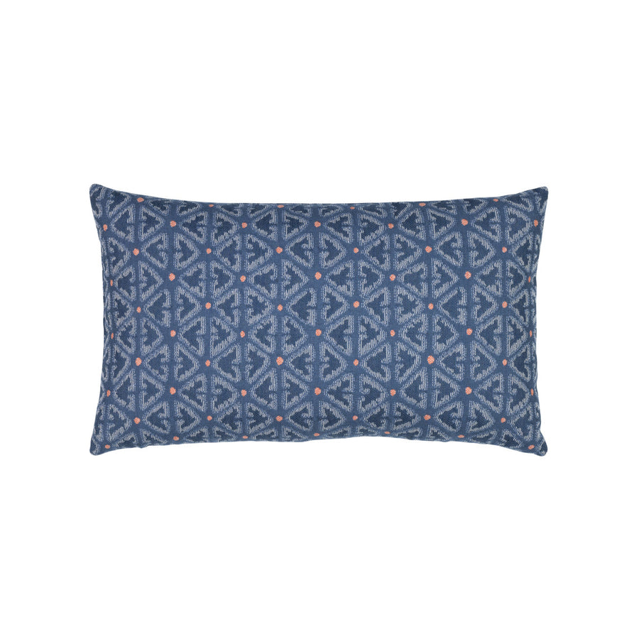 The geometric composition injects a dimensional quality in the Intricate pattern with a striking array of shades of blue. Balancing this palette with a pop of energetic apricot adds a playful contrast.