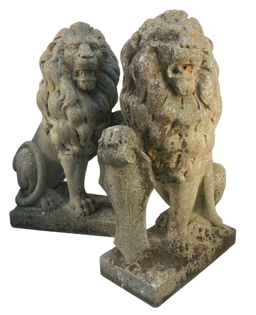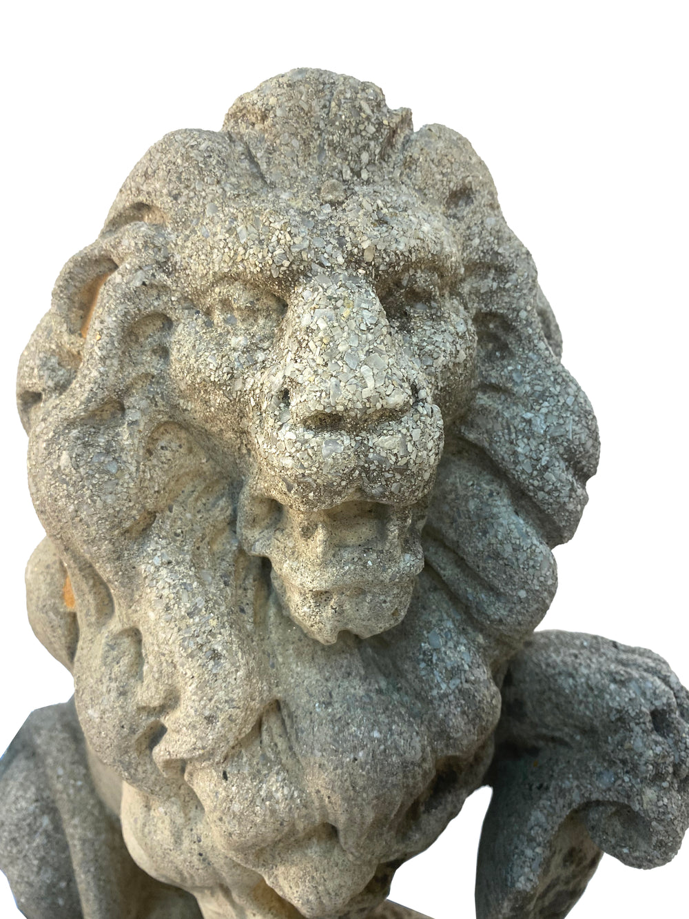 A pair of two concrete stone lions. Such a wonderful way to add a regal look to an entryway. (Or perhaps even a driveway.) Each lion sits on its hind legs, with its front paws outstretched holding a shield. The lions have a wonderful patina and have darkened with age. They each stand on a small square base.