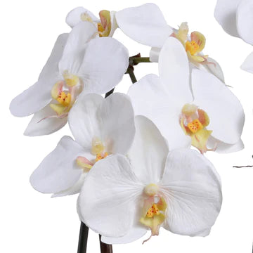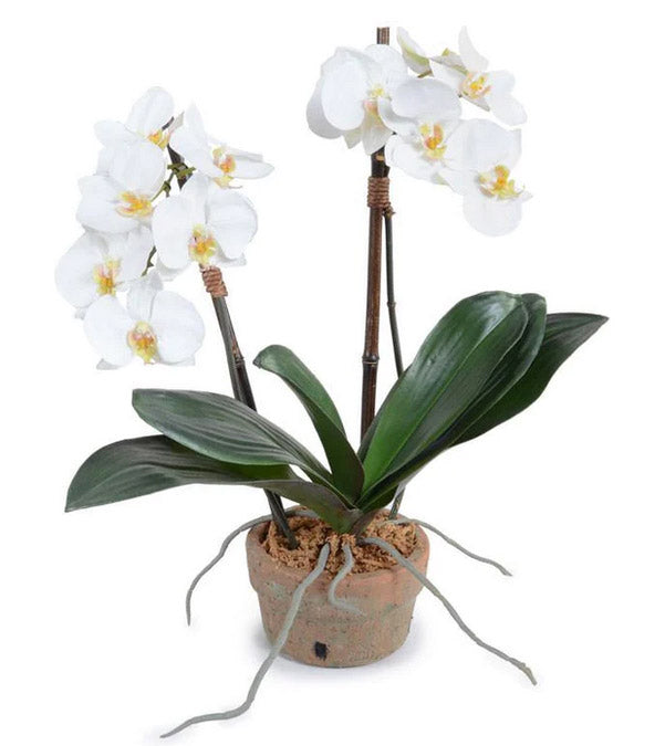 This lifelike Phalaenopsis Orchid reproduction will have your friends fooled into thinking you have a green thumb. Two small artificial orchid plants with lively green flowers, realistic visible roots, and wide dark green leaves are arranged by hand and tied to natural black bamboo stakes. Planted in a rustic 6" terracotta orchid pot, the pieces are permanently set in place with our signature faux Durt™ mixture.