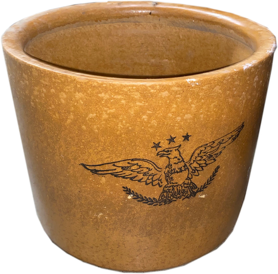 Be Patriotic! This 2 gallon glazed unmarked crock is in great vintage condition with no chip, cracks or hairlines. It is a blend of tan and rust color with the eagle in black. Repurpose! Its perfect for a potted plant or potted plant holder for in the garden, on the deck or patio. It could also be used for dry arrangement display.
