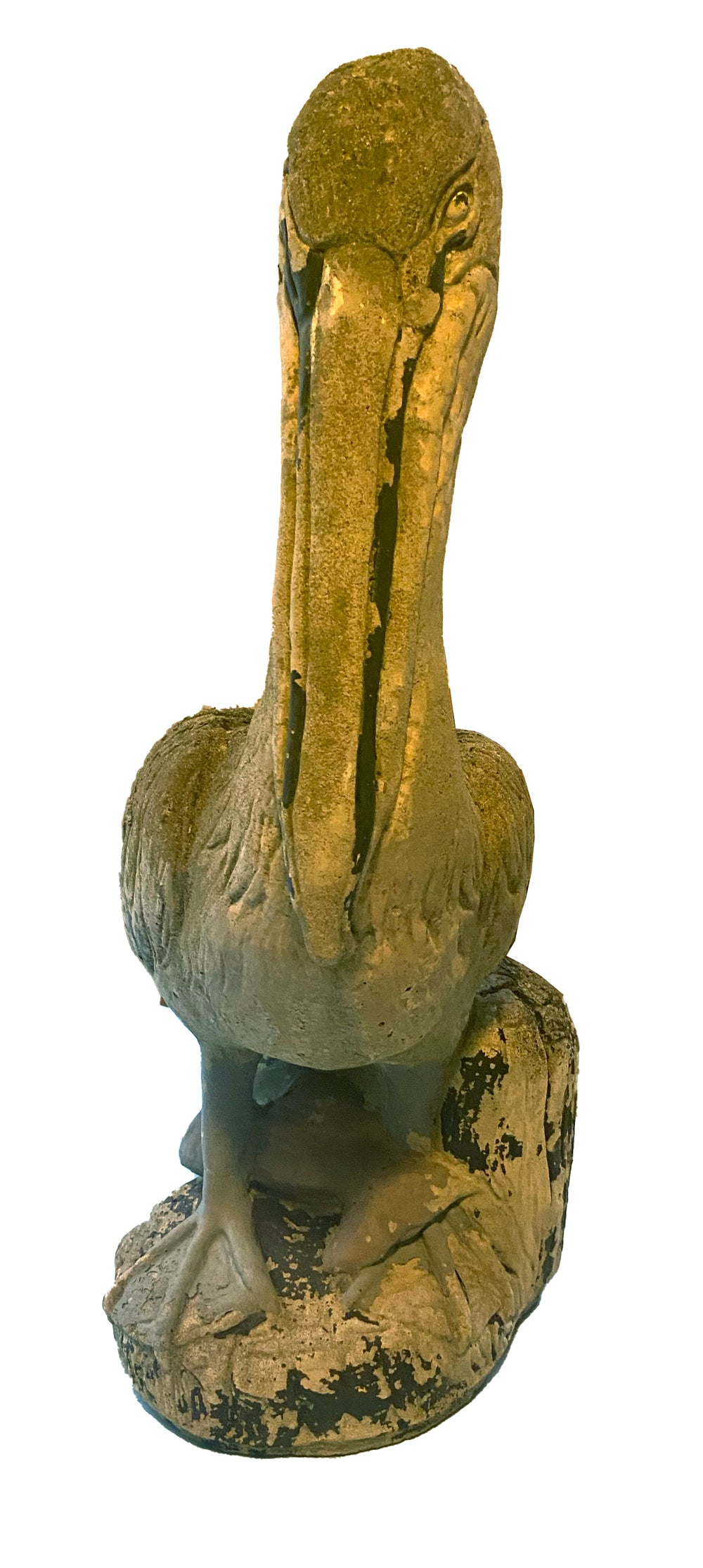 Hand-cast in heavy concrete with a beautifully aged finish, the piece features realistic feather detailing and a serene expression that captures the laid-back elegance of this iconic coastal bird. Whether placed by a water feature or nestled among your landscaping, it makes a striking focal point with coastal flair.