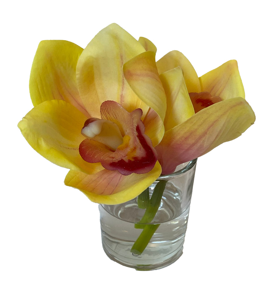 Radiating warmth and cheer, this lifelike yellow orchid blossom with soft pink accents is artfully displayed in a petite 2" round glass vase with realistic faux water. Its compact size makes it a perfect pop of color in any space, offering long-lasting beauty without the need for maintenance.
