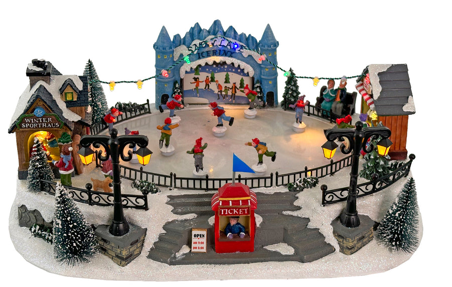 Step into a festive winter wonderland with this animated holiday ice rink village scene. Featuring skaters that glide across the ice, cheerful music, and twinkling LED lights, this charming piece brings the joy of the season to life. Delightful details include a snow-dusted ticket booth, cozy sporthaus, lighted lampposts, and whimsical string lights stretched across a blue castle façade.