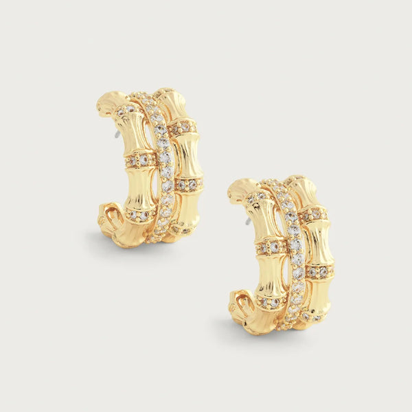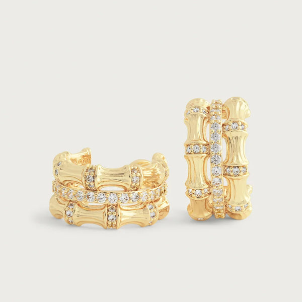 These earrings feature our best selling Bamboo Stacked Ring but in a timeless mini hoop. These 18k gold dipped pieces, with their exquisitely textured surfaces, are a captivating classic and a wardrobe staple. A stunning blend of nature and art, these hoops are the perfect statement piece for any outfit. Dress up any look with these 18k gold dipped beauties.