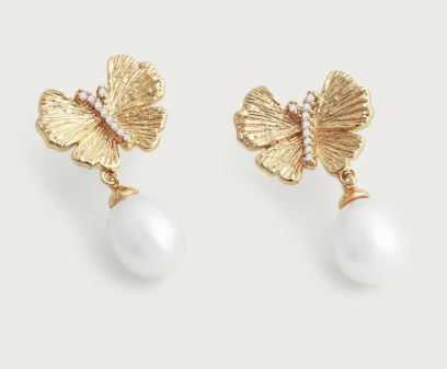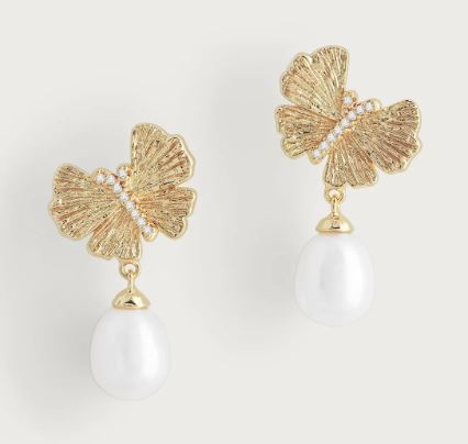 Take your accessorizing game to the next level with these Butterfly With Pearl Drop Earrings. Crafted with 18k gold dipped brass, pearls, and hand set crystals, these pieces are truly a work of art. Each earring features a beautifully sculpted butterfly adorned with glittering jewels and finished with a delicate pearl drop. Make a bold statement and add timeless glamour to any occasion with these must-have earrings.