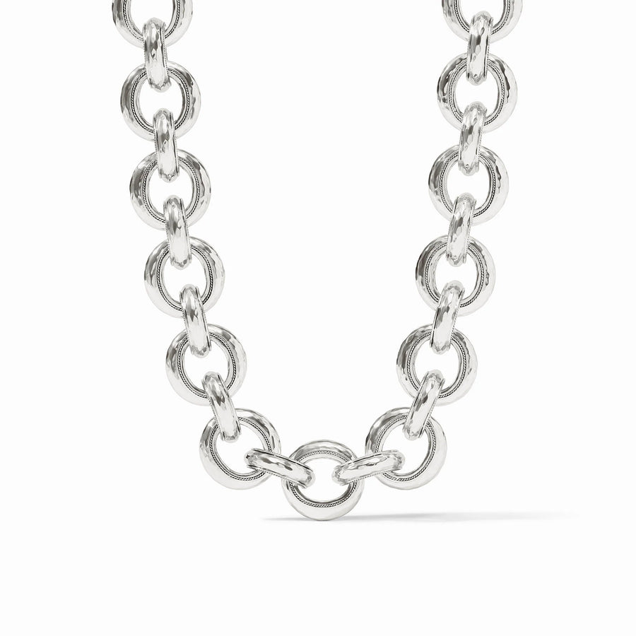 An elegant necklace of lightly hammered silver links featuring a splendid pierced design on the inside and finished with a toggle.