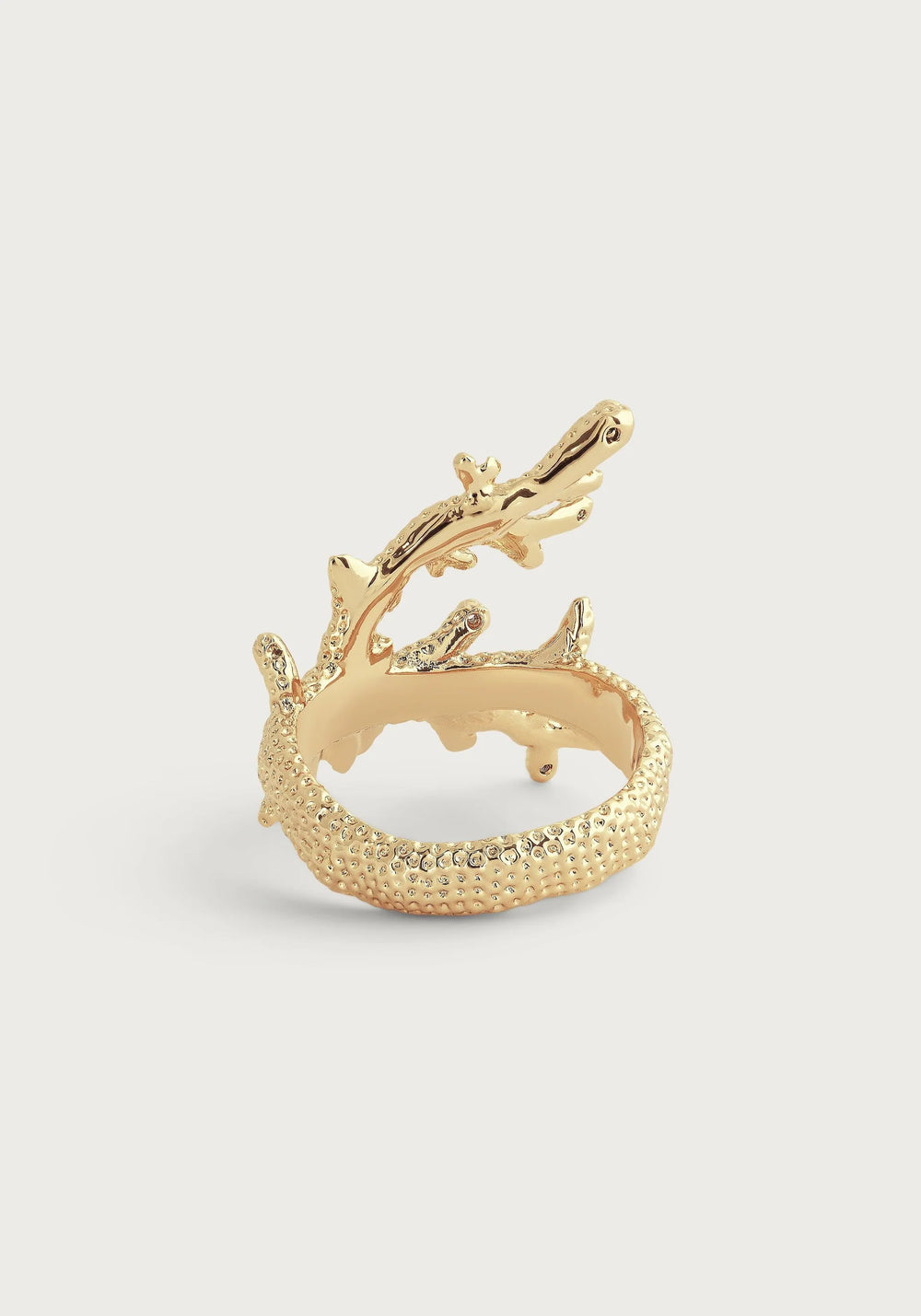 This beautiful, highly original ring is the perfect expression of nature and luxury. Handcrafted 18k gold dipped brass and studded with subtle shimmering hand set crystal accents, this ring seamlessly merges the raw beauty of nature with the aesthetic of fine jewelry. Immerse yourself in the natural world with Coral Ring. Our handcrafted 18k gold dipped brass exudes luxury, while the subtle shimmering hand set crystal accents add a touch of elegance. This stunning ring fuses the beauty of nature with the sophistication of fine jewelry, making it the perfect statement piece.