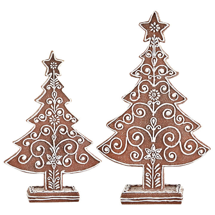Sweeten your seasonal décor with this charming Set of 2 Frosted Gingerbread Trees. Crafted from durable resin and designed to look like freshly baked gingerbread, each tree features intricate white icing-like detailing and a lightly "frosted" finish. With their delightful scrollwork and star toppers, these whimsical trees add a cozy, confectionery-inspired touch to mantels, tabletops, and holiday displays.