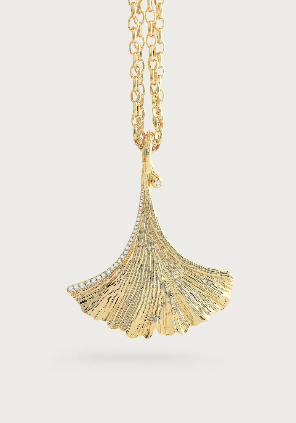 This necklace features an artfully sculpted ginkgo leaf with a twisted stem that serves as its own bale. The pendant is crafted in 18k gold dipped brass, accented with shimmering hand set crystals. The 36” chain can be worn doubled or long, making it a versatile piece for any occasion or outfit.