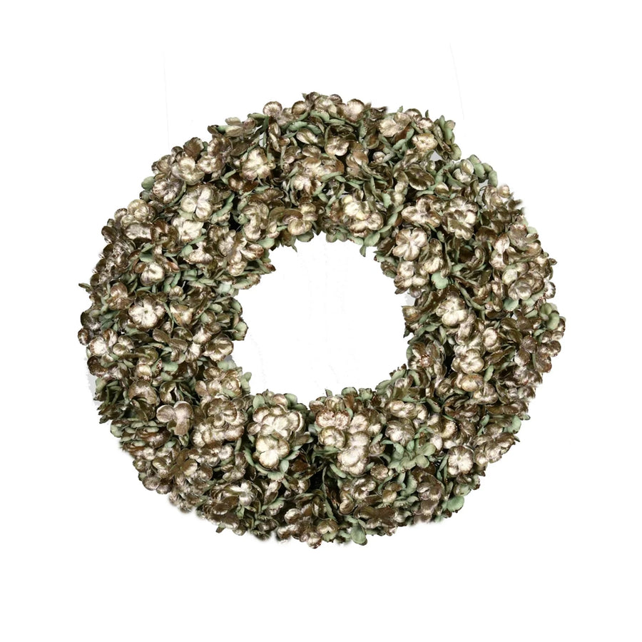 Bring elegant shimmer to your seasonal decor with this 24" Glittered Hydrangea Wreath. Lush faux hydrangea blooms in soft green and champagne tones are generously dusted with golden glitter for a subtle sparkle that catches the light beautifully. Perfect for doors, mantels, or over a mirror, this full, dimensional wreath adds a refined touch of holiday glamour while remaining versatile enough for use throughout the winter season. A stunning statement piece with timeless appeal.