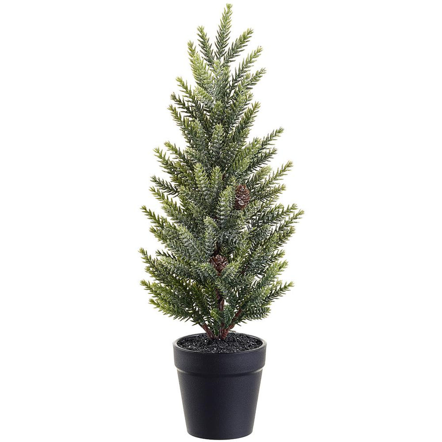Add a touch of winter charm to your holiday décor with this glittered pine tree, set in a classic black pot. Accented with subtle glitter and tiny pine cones nestled among lifelike evergreen branches, this petite tree brings natural elegance to mantels, tabletops, and entryways.