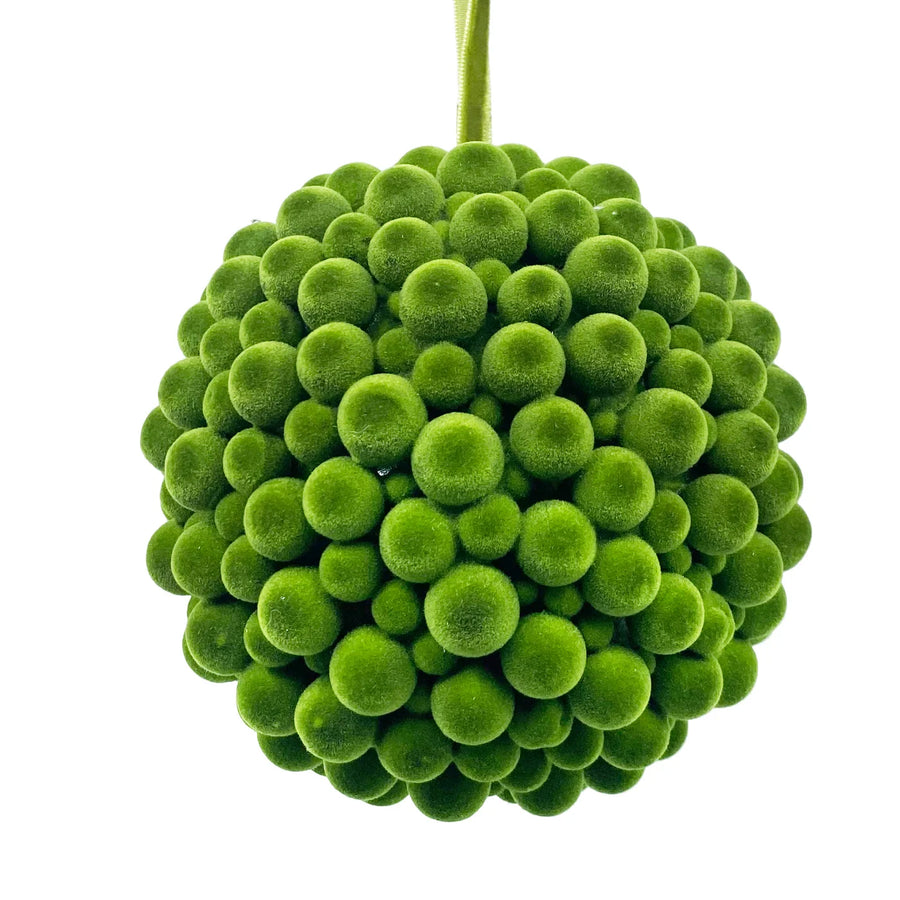 A modern twist on a classic holiday tradition, this Green Flocked Kissing Ball adds a touch of playful texture and festive charm to your seasonal decor. Covered in soft, velvety flocked spheres, its bold green hue brings fresh, vibrant color to mantels, doorways, or chandeliers. Hang it with ribbon for a whimsical touch or cluster several for a contemporary holiday display. A versatile accent that blends fun and elegance in equal measure.